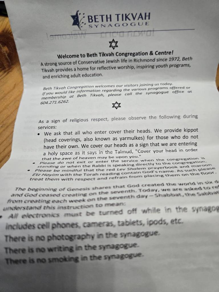 Today, I was invited to attend a service at Beth Tikvah Congregation & Centre in Richmond, BC, by Rabbi Susie Tendler. I reached out to Rabbi Susie Tendler on the day I first heard the news of the antisemitic shooting at Bondi Beach in Sydney, Australia, simply to express care and solidarity. I went today as a neighbour who wanted to show up, to listen, and to stand with the local Jewish community.
